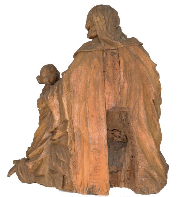 Süddeutschland, um 1650, Anna Selbdritt, Holz, holzsichtig, rückseitig gehöhlt, Altersspuren, u.a. fehlen oder sind beschädigt der kleine Finger von Annas linker und rechter Hand, Zeigefinger und Ringfinger der linken Hand vom Jesulein, sein rechter Arm, die beiden Arme von Elisabeth sowie die Fußspitze von Anna, H 78 cm. / South Germany, 1st half of the 17th century, Anna Selbdritt, wood, hollowed back, traces of age or missing, i.a. the little finger of Anna's left and right hand, index finger and ring finger of the left hand of little boy Jesus, his right arm, both arms of Elisabeth as well as the tip of Anna's foot are missing or damaged, h 78 cm.