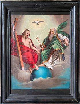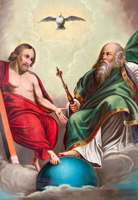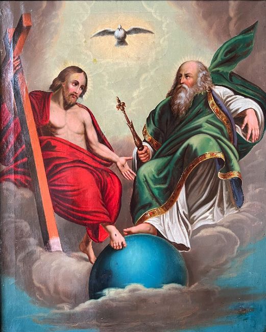 Unbkannter Künstler, 18./19. Jh., Die Dreifaltigkeit mit Jesus, Gottvater und dem Heiligen Geist in himmlischen Spähren, die Füße auf der Weltenkugel ruhend, Öl/Lwd., Altersspuren, teils restauriert, 73 x 56 cm. Unknown artist, 18th/19th century, The Trinity with Jesus, God the Father and the Holy Spirit in heavenly spheres, the feet resting on the globe, oil on canvas, traces of age, partially restored, 73 x 56 cm.